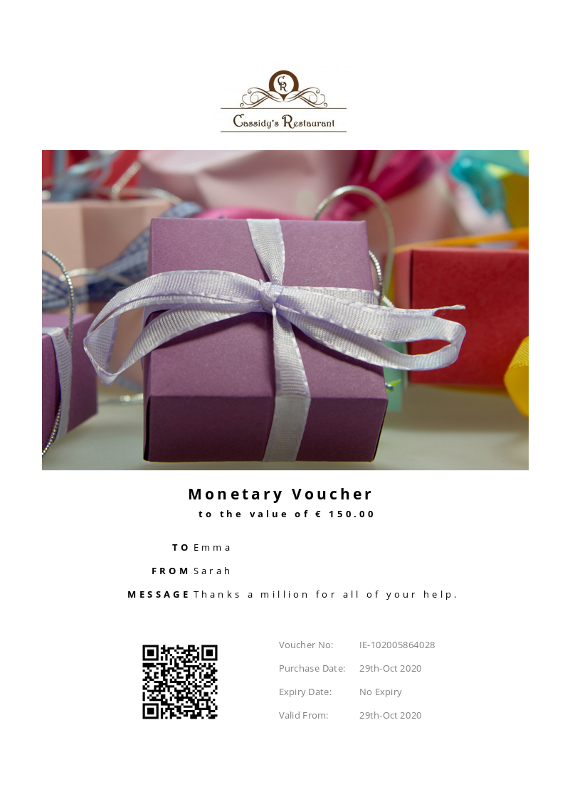 Cassidy's Restaurant Tralee allows you to purchase instantly printable gift vouchers, special offers and tickets using the Voucher Connect platform.